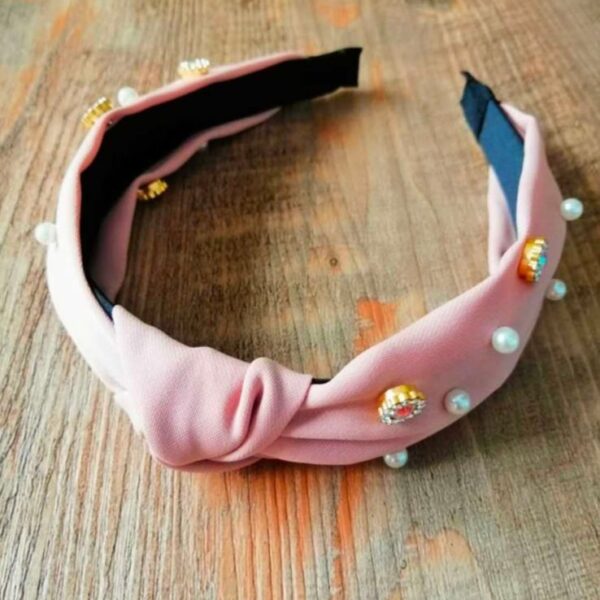 Cintillo en tono celeste con decoración de perlas blancas y doradas.