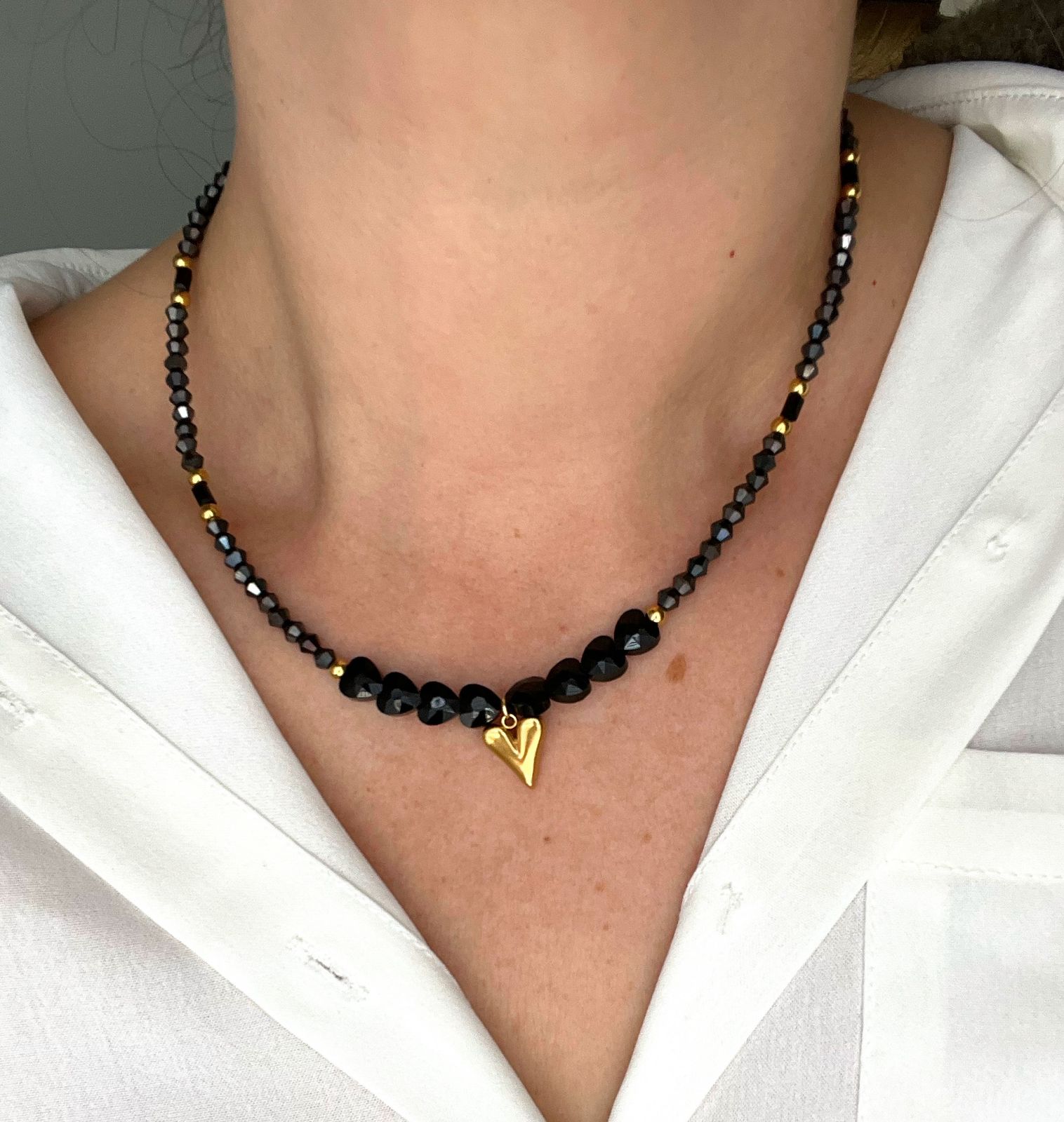 Collar de cristales en tono gris profundo, decorado con cristales en forma de corazon negro y dije de corazon alargado en tono dorado.
