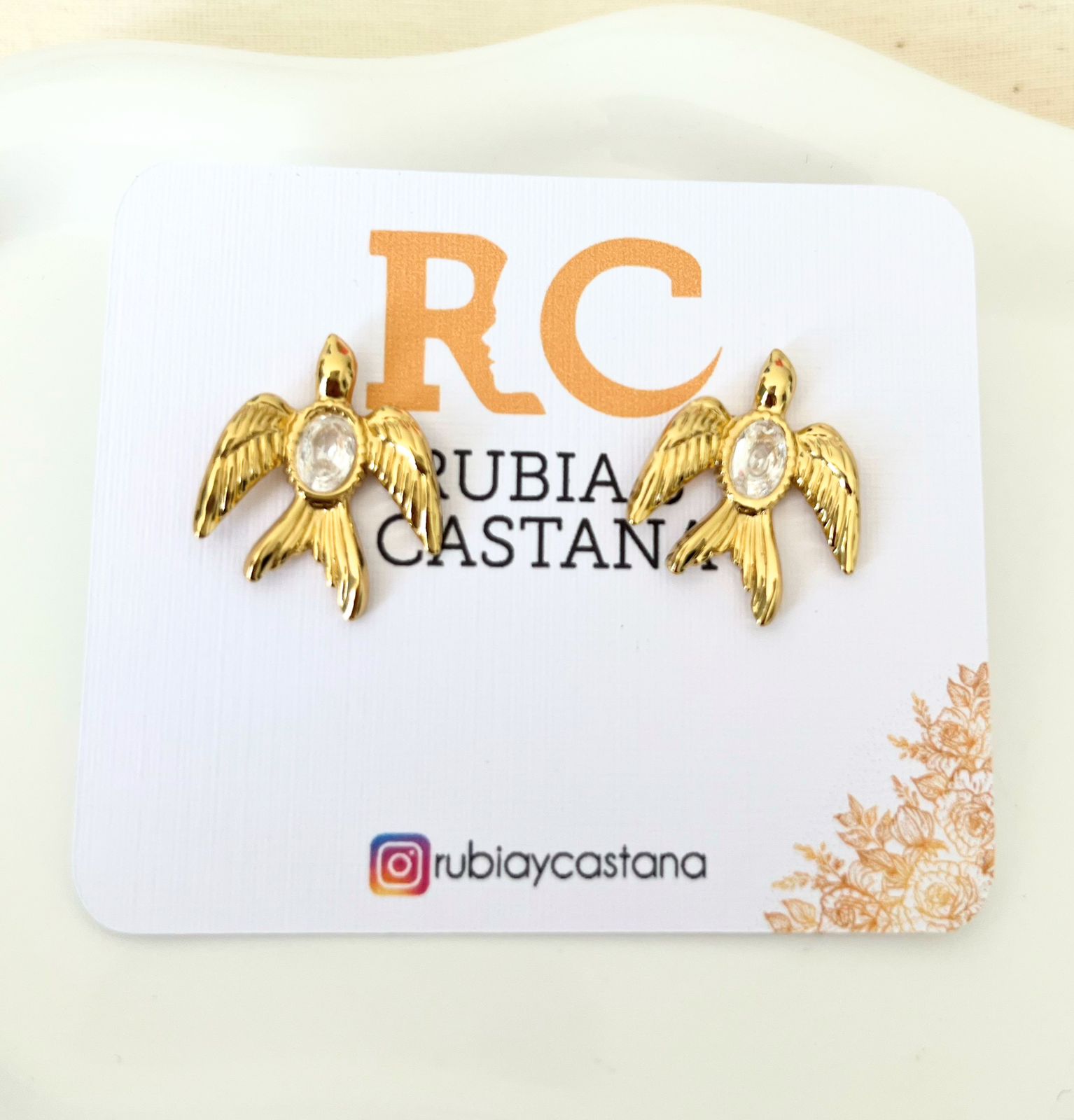 Aros bañados en oro con forma de gorrión y cristal blanco en el centro.