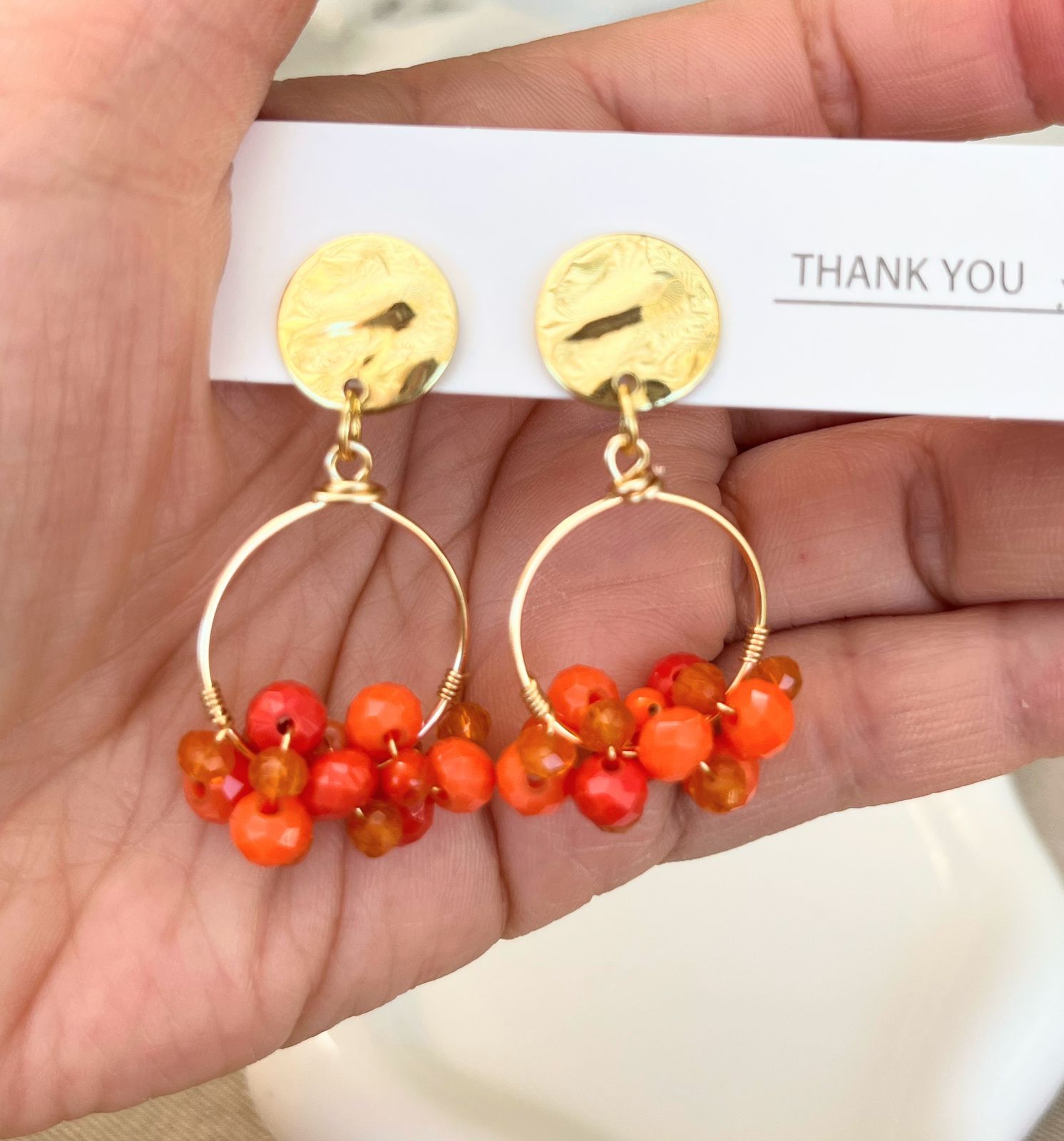 Aros con base circular de fantasía en tono dorado, decorada con círculos de cristal enroscados en tonos naranjos.