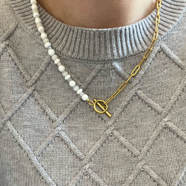 Aros con base bañada en oro y técnica de cadena hecha a mano con perlas fantasía.