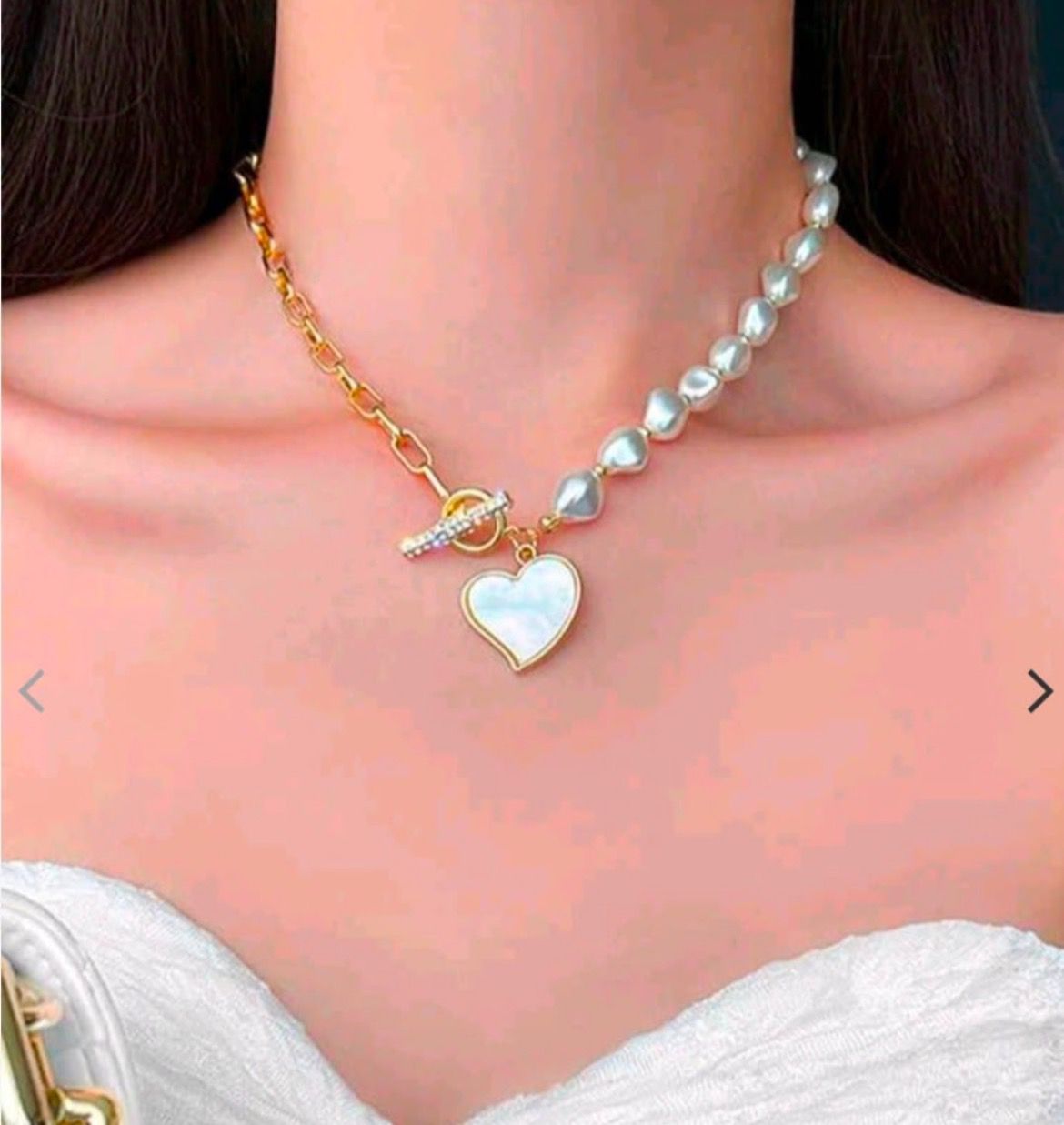Collar de fantasía con perlas y dije de corazon blanco esmaltado.