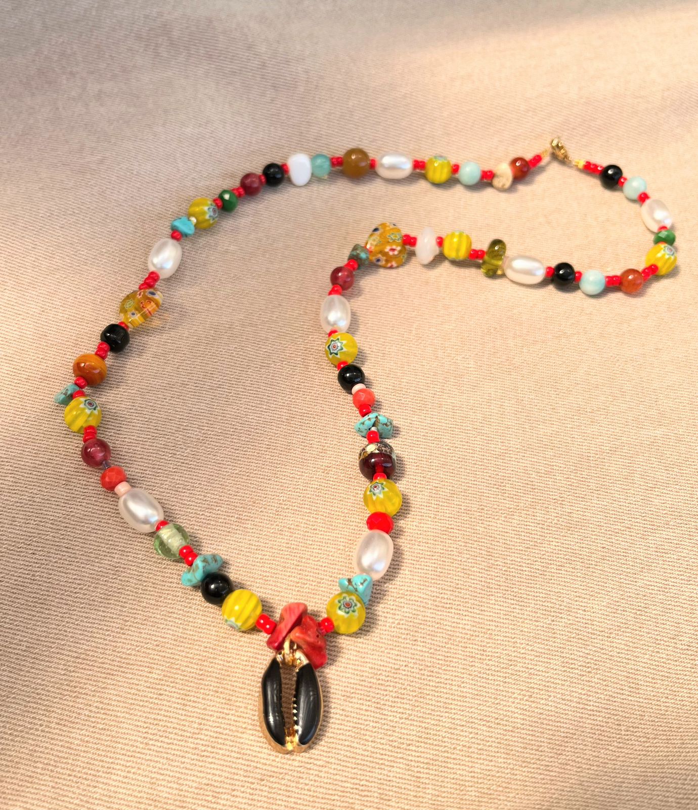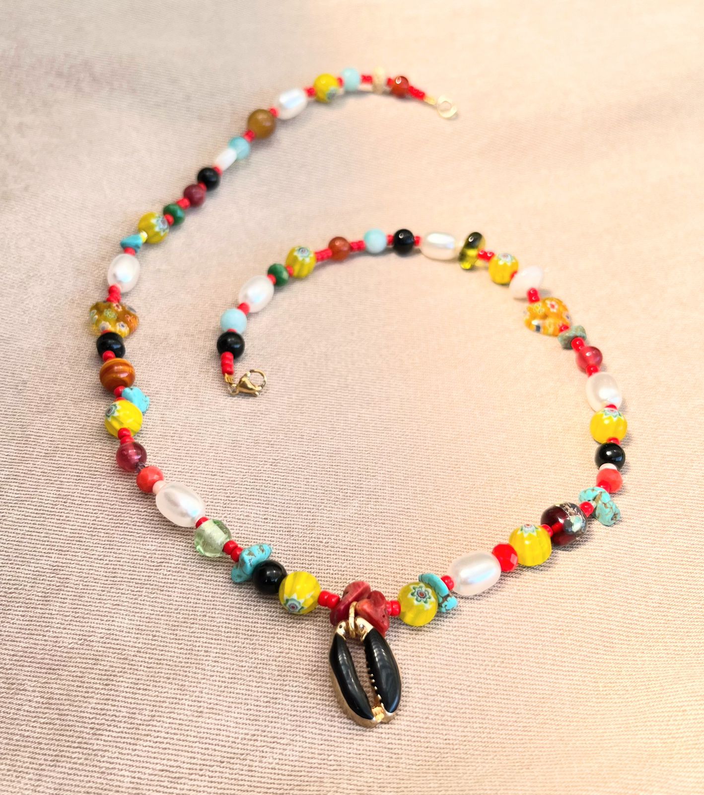 Collar colorido con cristales, piedras, mostacillas y perlas de fantasía, con dije de concha negra.