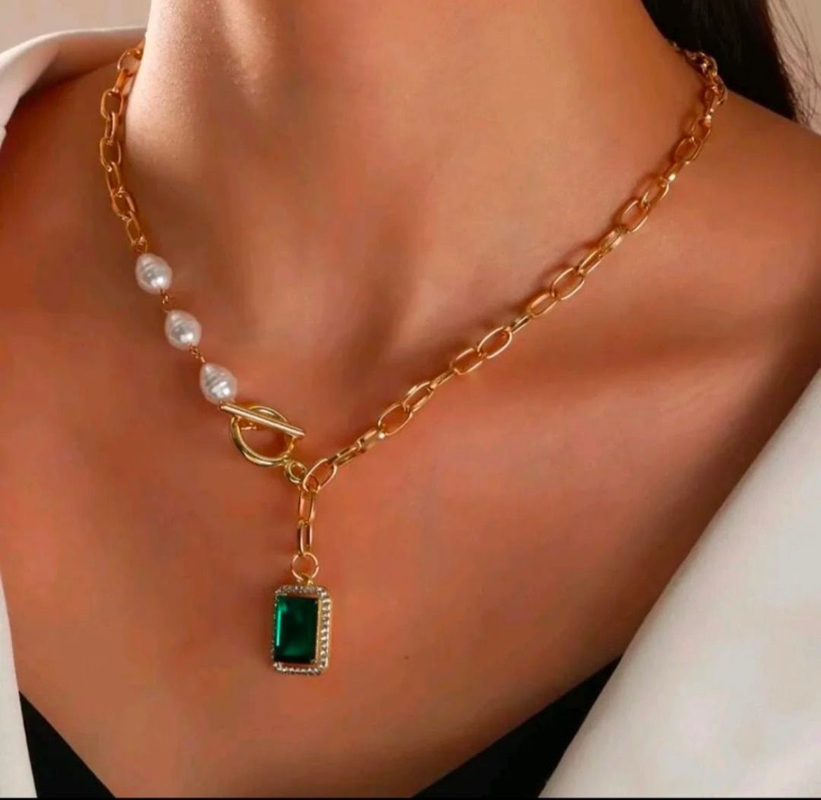 Collar de fantasía de cadena dorada, perlas y dije de cristal de imitación en tono verde.