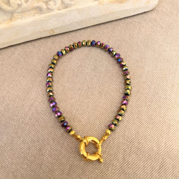 Hermosa pulsera de cadena bañada en oro, decorada con perlas de rio tipo arroz, y dije religioso chapado en oro, con cristales brillantes al rededor.